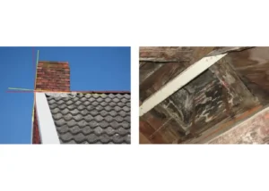 Horizontale scheurvorming of scheefstand in de zijgevels (bv. van een grote schuur) door invloed van trekkrachten vanuit de spatkrachten op de zijgevels door veranderingen van belastingen op de sporenkap.
